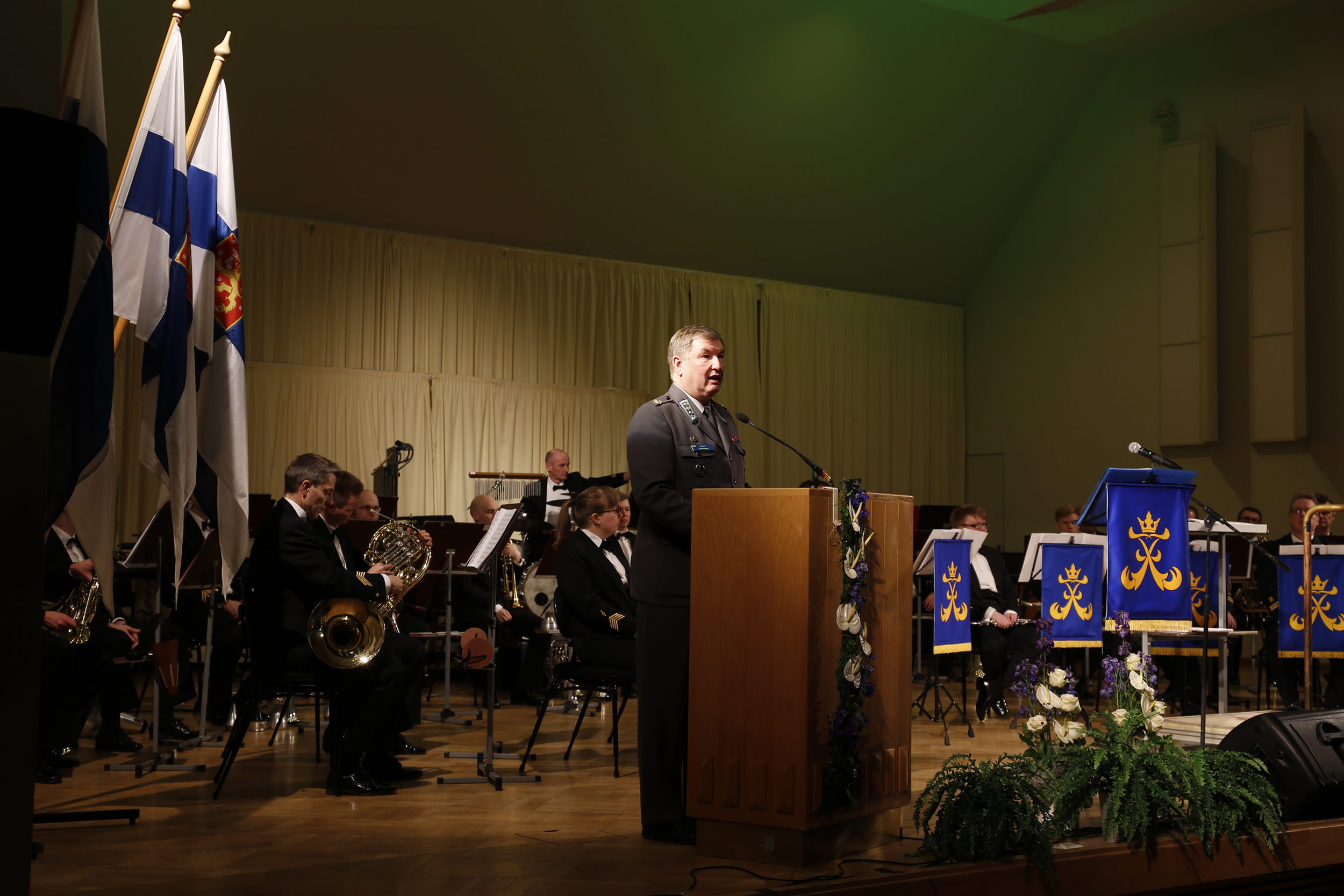 Konsertin avauspuheessa Karjalan prikaatin apulaiskomentaja, eversti Pertti Kuokkanen kertoi vuosipäivän perustuvan Ruotsin kuningas Kustaa Vaasan 24.2. vuonna 1555 antamaan määräykseen perustaa ensimmäisen kerran kansallisia, suomalaisia joukko-osastoja. Puolustusvoimain komentaja vahvisti sittemmin päivämäärän maavoimien ja aluetoimistojen vuosipäiväksi. Puolustusvoimien nykytilannetta hän kuvaili juuri julkistetun selonteon mukaan. Muun muassa muuttunut toimintaympäristö, toiminta ja sotilaallinen jännittyneisyys Itämerellä ovat lisääntyneet. Suoranaista uhkaa Suomena kohtaan ei selonteon mukaan ole, mutta puolustukseen kohdistuu vaatimuksia mahdollisen kriisin tullessa keinojen yllätyksellisyys ja monimuotoisuus. - Puolustusvoimien tehtävät edellyttävät nykyistä korkeampaa toimintavalmiutta maa-, meri- ilma- ja kybertoimintaympäristöissä sekä parempaa kaukovaikuttamiskykyä, sanoi eversti puheessaan. - Puolustuksen ennaltaehkäisykyky perustuu toimintaympäristöön suhteutettuun valmiuteen ja torjuntakykyyn. Suomi varautuu sotilaallisten uhkien torjuntaan ylläpitämällä nykymuotoista, suorituskykyisiin asejärjestelmiin ja laajaan reserviin perustuvaa puolustusratkaisua. Toimintaympäristön muutoksen edellyttämä valmius, nopeasti käytössä olevat joukot ja järjestelmät sekä laaja koulutettu reservi edesauttavat mahdollisuuksia vastata sekä nopeasti kehittyvään että pitkäkestoiseen sotilaalliseen kriisiin. Puolustusyhteistyö vahvistaa normaali- ja poikkeusolojen puolustuskykyä sekä parantaa uhkien ennaltaehkäisyä sekä edesauttaa poliittisen ja sotilaallisen avun saamista tarvittaessa, jatkoi Kuokkanen.