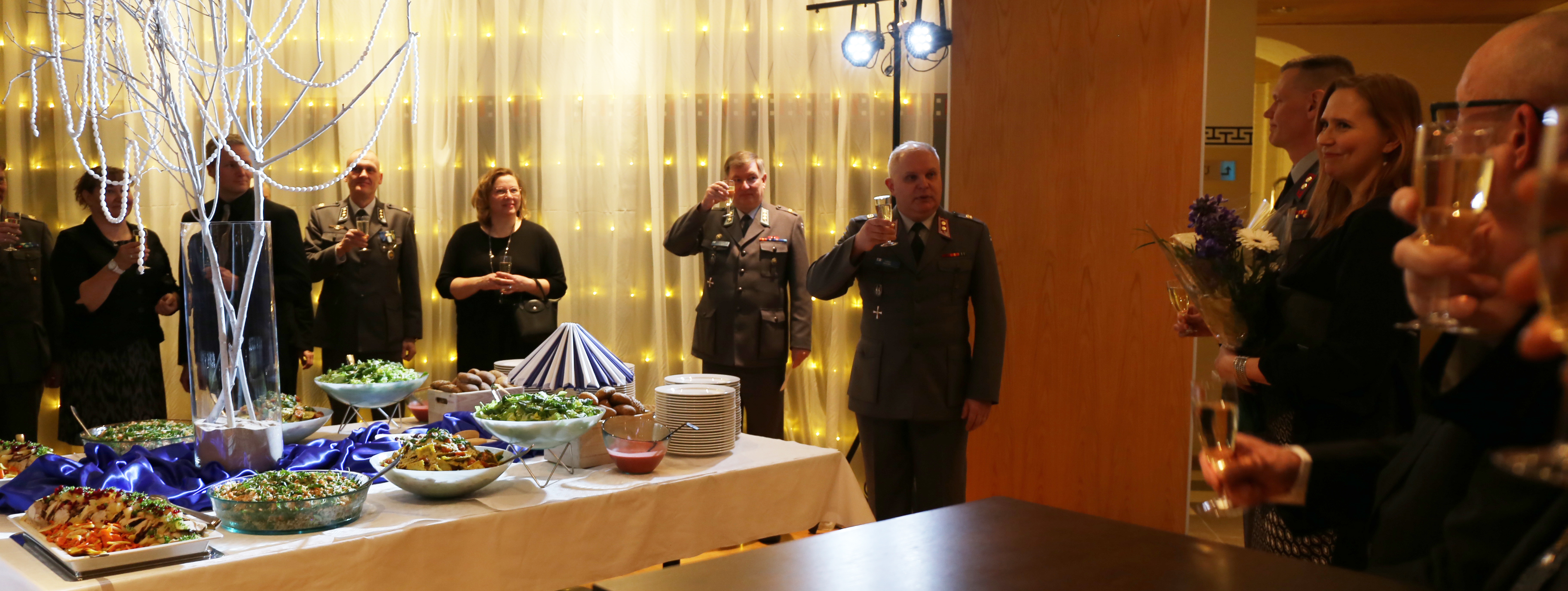 Konserttiin oli kutsuttu aluetoimiston henkilökuntaa, yhteistyökumppaneita ja alueen veteraaneja. Ennen konserttia kutsuvieraat kokoontuivat ravintola Vaustiin, joka on Kotkan konserttitalon yhteydessä. Tervetulosanojen jälkeen everstiluutnantti Saku Muona ojensi edeltäjälleen, everstiluutnantti Esa Hyytiäiselle Kaakkois-Suomen aluetoimiston pienoislipun ja rouva Hyytiäiselle näyttävän kukkakimpun. Uusi päällikkö kehui everstiluutnantti Hyytiäisen tehneen hyvän pohjatyön aluetoimistossa, josta on hyvä jatkaa. Esa Hyytiäinen siirtyi Maasotakoulun esikuntapäälliköksi Lappeenrantaan.