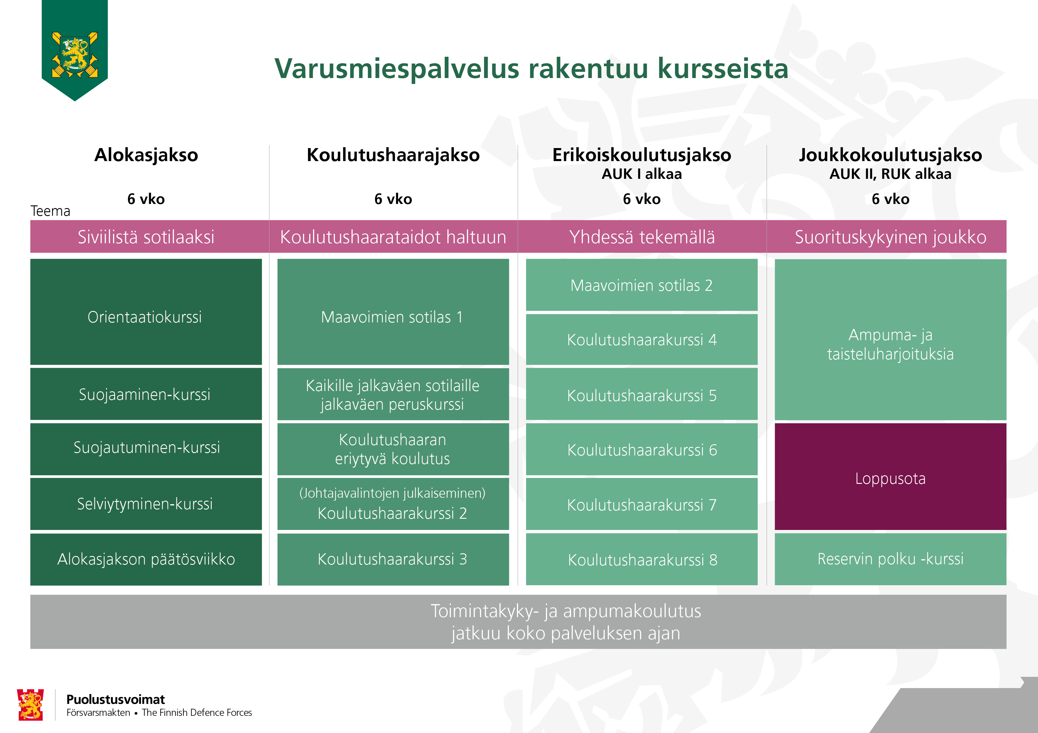 Varusmiespalvelus muodostuu jaksoista, kursseista ja harjoitteista.