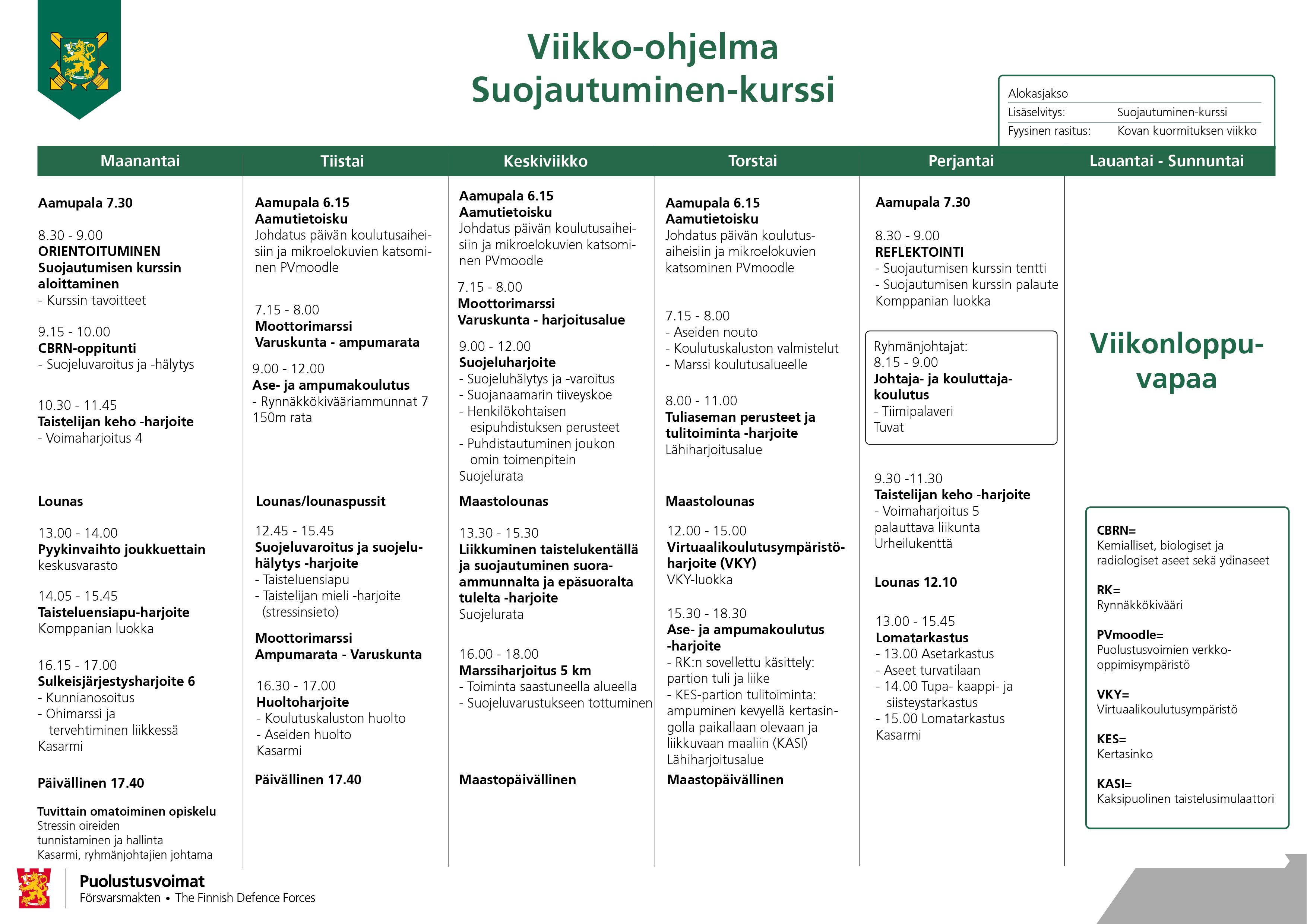 Esimerkki siitä, miltä alokasjaksoon kuuluva Suojautuminen-kurssin viikko-ohjelma näyttää. Koulutus on tehokasta maanantaista perjantaihin.