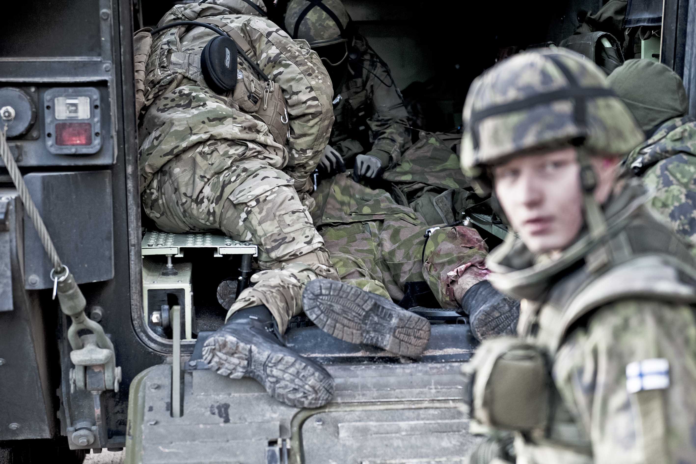 Kansainvälistä lääkintähuollon yhteistyötä RECCEX16 -harjoituksessa Ruotsissa. Harjoituksen potilaat maskeerataan näyttämään mahdollisimman aidoilta. Kuva: Mattias Nurmela, Ruotsin puolustusvoimat