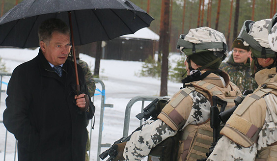 Tasavallan presidentti Sauli Niinistö tarkastaa Porin prikaatin tiistaina 26. tammikuuta 2016 yhdessä puolustusvoimain komentajan, kenraali Jarmo Lindbergin kanssa.