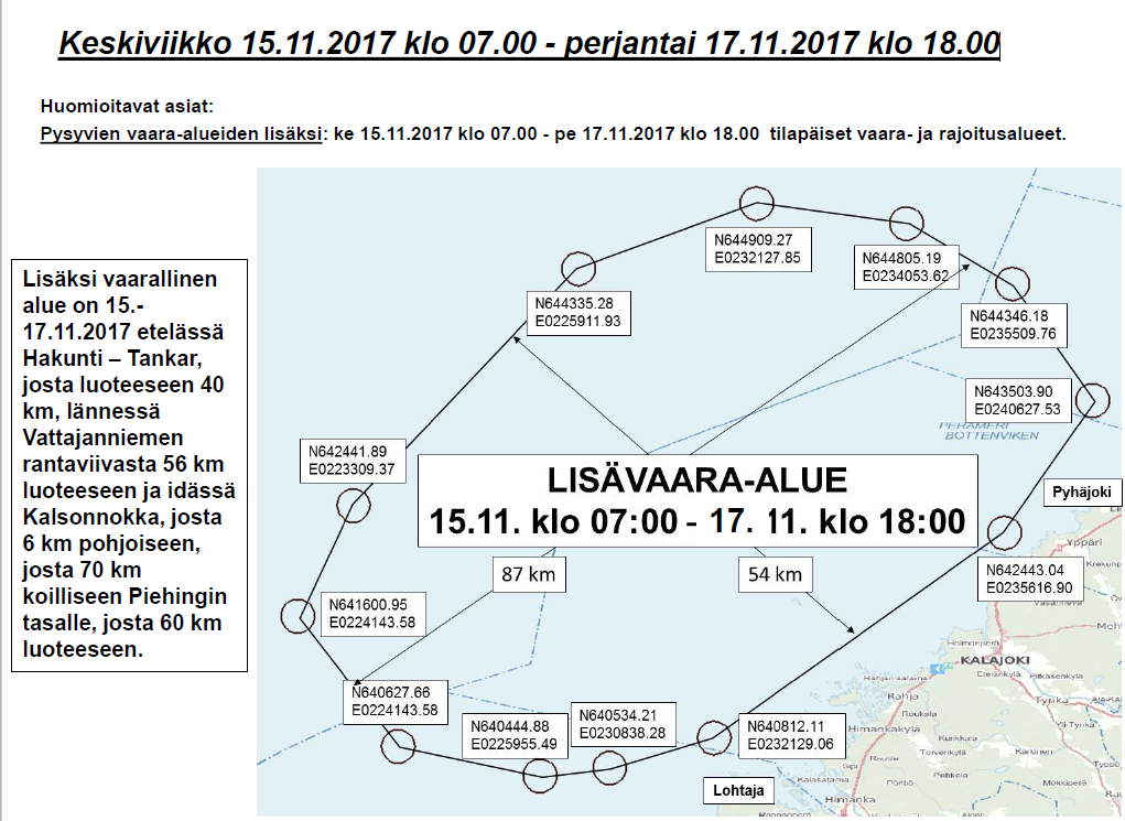 Ilmapuolustusharjoitus on kaksivaiheinen. Harjoituksen ampumavaiheessa 14.11. - 18.11. ammutaan kovapanosammunnat ilmatorjunnan ohjusjärjestelmillä sekä ammusaseilla. Pysyvien vaara-alueiden lisäksi, harjoituksen aikana on käytössä myös tilapäisiä vaara- ja rajoitusalueita. Suljettavat alueet ja ajankohdat on merkitty oheiseen karttaan.