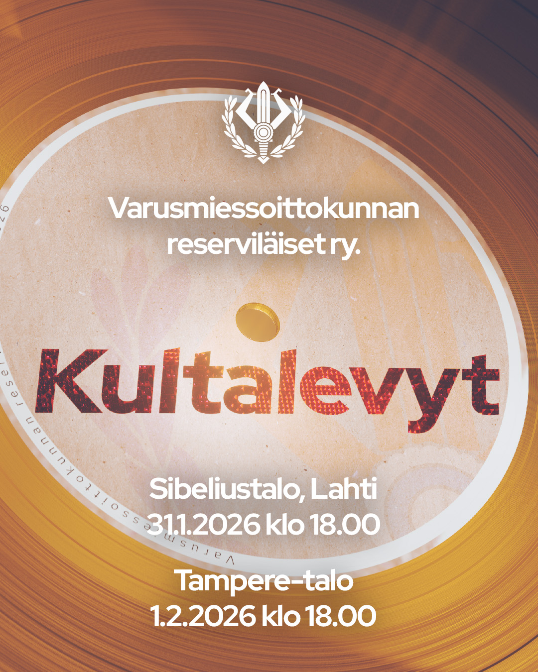 Puolustusvoimien soittokunnissa varusmiespalveluksensa suorittaneiden reserviläisten Kultalevyt-megakonsertit järjestetään Lahdessa 31.1. ja Tampereella 1.2.2026.