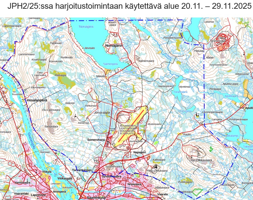 F/A-18 Hornet fighter operations from Rovaniemi Air Base will be seen in the exercise on 24-27 November 2025. Flight activities will end daily by 10 pm on 24-27 November and by 5 pm on 27 November. The flights will be directed to the area between Ivalo and Kajaani. The fighters participating in the exercise will use chaff and flares that may be seen as momentary bright spots of light in the sky and cause echoes on weather radar.