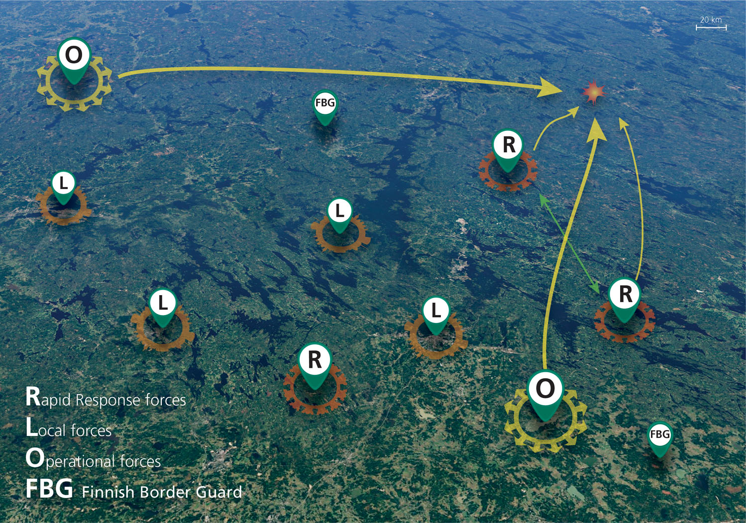 Consequently, it is possible to cover the entire area of the country by combat sustained by the RRF, operational forces as well as local forces supplemented by supportive functions. The land defence forces exploit their operational mobility and effective fires capability. Flexibly utilizing the land defence forces and being supported by the joint capabilities of the Finnish Border Guard and Defence Forces enables shifting the point of main effort of the operation in whichever location within the country that the situation requires. However, the capability still remains for sustained defence by means of local forces with nation-wide coverage.