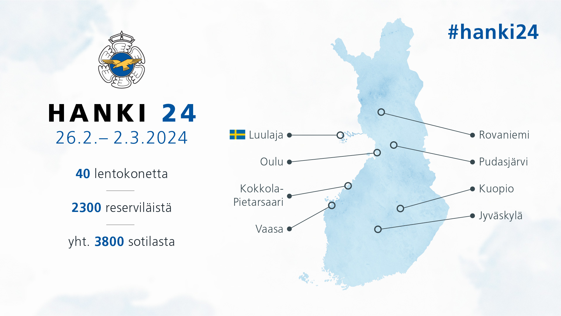 Flygvapnet arrangerar luftoperationsövningen Hanki 24 under perioden 26.2.‒2.3.2024. Sammanlagt cirka 40 flygplan och 3 800 soldater deltar i övningen.