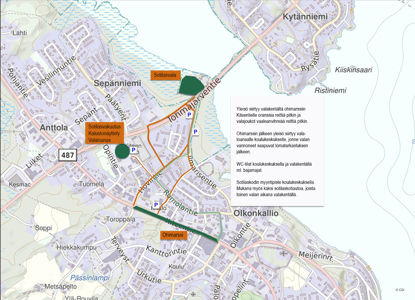Valaopasteet ohjaavat liikennettä ja sotilaspoliisi ohjaa ajoneuvot käytettävissä oleville paikoitusalueille. Inva-kylteillä varatuille ajoneuvoille on varattu paikoitus läheltä Rantakenttää. Kävelyetäisyydet Kiteellä ovat lyhyitä valakentän, ohimarssireitin ja Arppen koulun välillä.