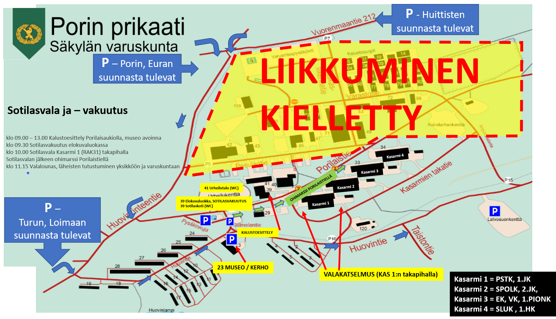 kello 10.00 Sotilasvala kasarmi 1 (rak. 31) takapihalla, minkä jälkeen ohimarssi Porilaistiellä.
