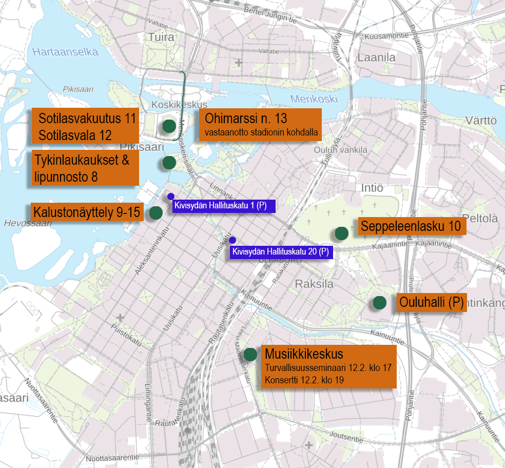 Tilaisuudet Oulussa ovat sotilasvakuutusta lukuun ottamatta ulkotilaisuuksia, joten kannattaa varautua sään mukaisella vaatetuksella ja mukavilla jalkineilla.
